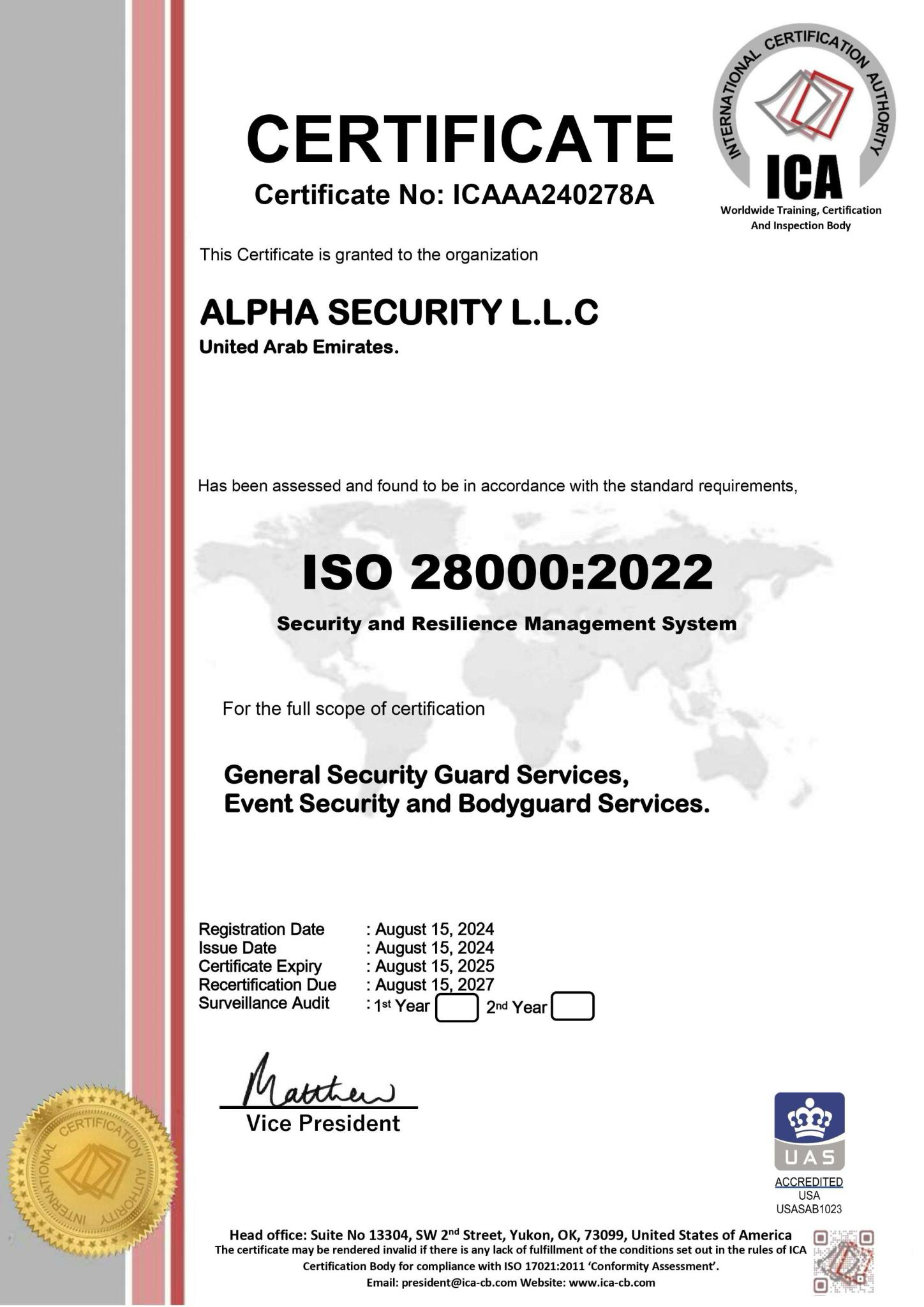 At Alpha Security, we are proud to uphold the highest international standards, which are supported by our comprehensive certifications across a range of critical areas. These certifications demonstrate our unwavering commitment to excellence, safety, and environmental responsibility, ensuring that we consistently deliver world-class security solutions across the UAE.